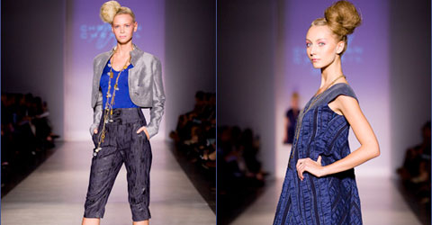 Similarly, the blue zip front trapeze dress invokes the spirit of classic looks from either cited designer. Rounding out the collection with striped wide leg trousers, a modern graphic print skirt suit and a variety of obi belts, Christian Chenail proved that it is possible to draw from the archives without sacrificing originality.